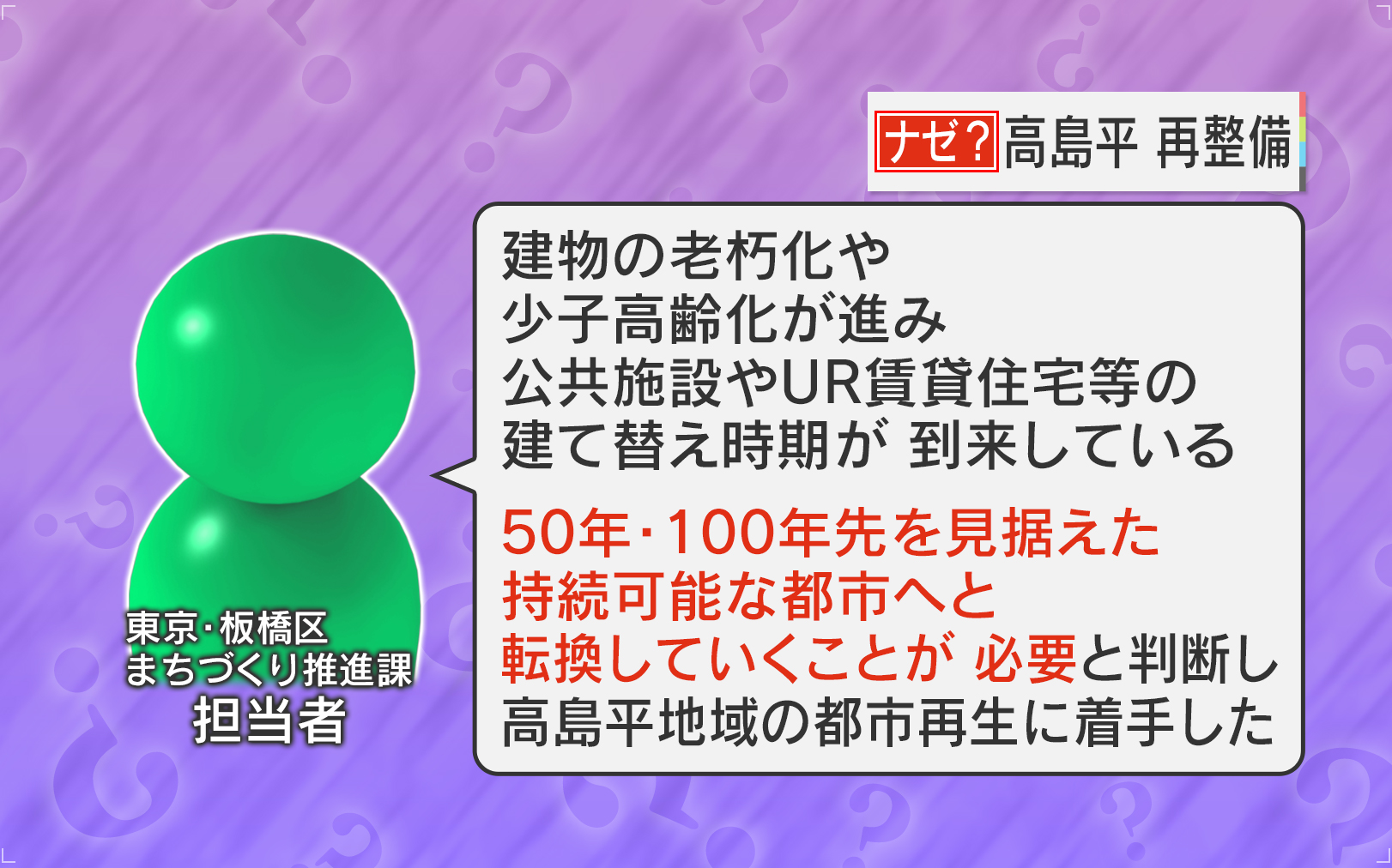 再整備の理由について、東京・板橋区まちづくり推進課の担当者によると、「建物の老朽化や少子高齢化が進み、公共施設やUR賃貸住宅等の建て替え時期が到来している。50年・100年先を見据えた、持続可能な都市へと転換していくことが必要と判断し、高島平地域の都市再生に着手した」ということです。