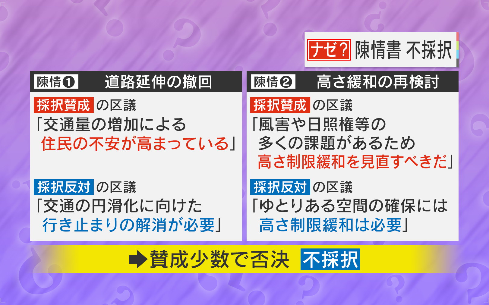 そして区議会では、陳述①道路延伸の撤回については「交通量の増加による住民の不安が高まっている」「交通の円滑化に向けた行き止まりの解消が必要」、陳述②高さ緩和の再検討については「風害や日照権等の多くの課題があるため、高さ制限緩和を見直すべきだ」「ゆとりある空間の確保には、高さ制限緩和は必要」など、議員からも様々な意見が出ました。しかし、賛成少数で否決され、陳述書は不採択となりました。