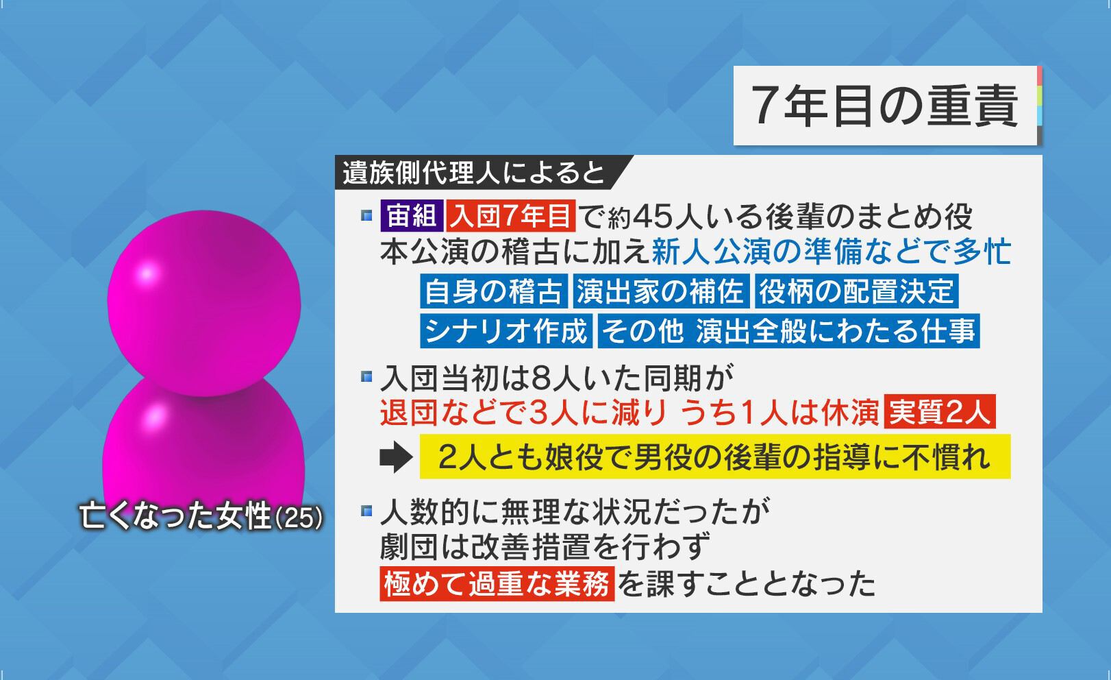 また、遺族の代理人は「女性は、入団7年目で約45人いる後輩のまとめ役だった。入団当初は8人いた同期が退団などで3人に減り、うち1人は休演していた。残った2人とも娘役で男役の後輩の指導に不慣れだった。人数的に無理な状況だったが劇団は改善措置を行わず、極めて過重な業務を課すこととなった」と主張しています。