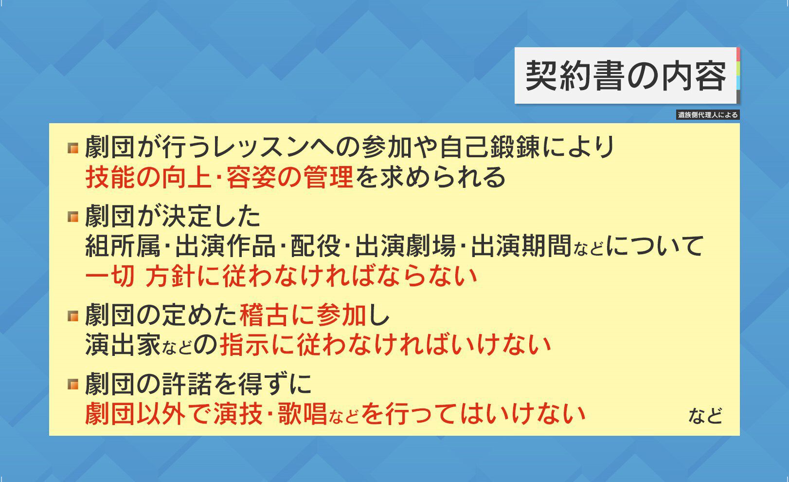 遺族側代理人によりますと、宝塚歌劇団と女性との契約書の内容は、以下のようになっていました。