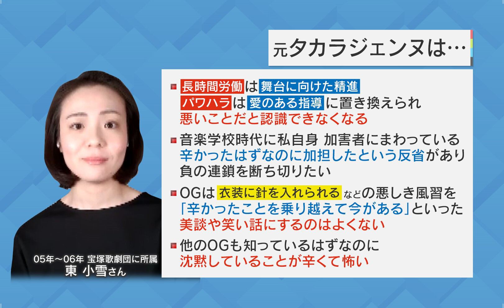 元宝塚歌劇団の東小雪さんは「長時間労働は舞台に向けた精進、パワハラは愛ある指導に置き換えられ悪いことだと認識できなくなる。音楽学校時代に私自身、加害者にまわっている。辛かったはずなのに加担したという反省があり、負の連鎖を断ち切りたい。OGは衣装に針を入れられるなどの悪しき風習を、『辛かったことを乗り越えて今がある』といった美談や笑い話にするのはよくない。他のOGも知っているはずなのに沈黙していることが辛くて怖い」と話しています。