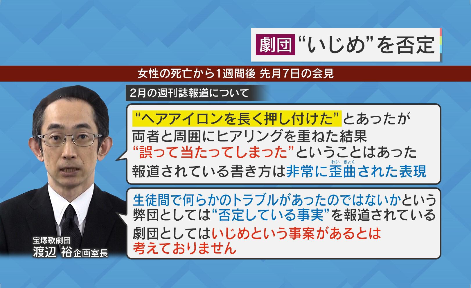 2月の報道について劇団側は、女性が死亡した後も「“ヘアアイロンを長く押し付けた”とあったが、両者と周囲にヒアリングを重ねた結果“誤って当たってしまった”ということはあった。報道されている書き方は、非常に歪曲された表現」「生徒間で何らかのトラブルがあったのではないかという、弊団としては“否定している事実”を報道されている。劇団としては、“いじめ”という事案があるとは考えておりません」とコメントしています。また同会見で、調査委員会の立ち上げも発表しています。