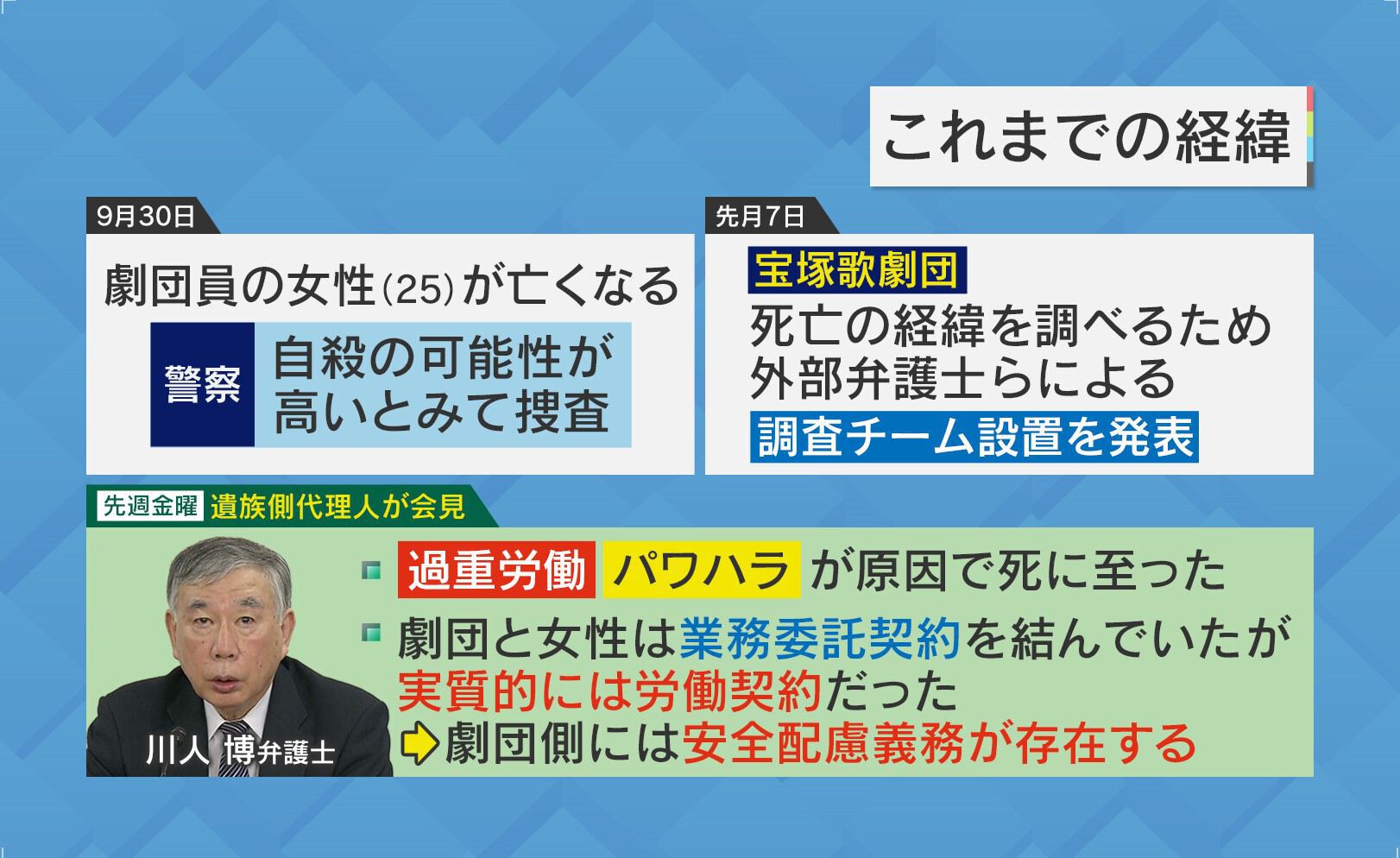 9月30日、宝塚歌劇団の劇団員の女性が亡くなり、警察は自殺の可能性が高いとみて捜査をしています。10月7日劇団は、死亡の経緯を調べるため外部弁護士らによる調査チームを立ち上げたと発表しました。11月10日、遺族側の弁護人が会見を開き、「女性は、過重労働・パワハラが原因で死に至った。劇団と女性は業務委託契約を結んでいたが、実質的には労働契約だった。劇団側には安全配慮義務が存在する」と主張しました。