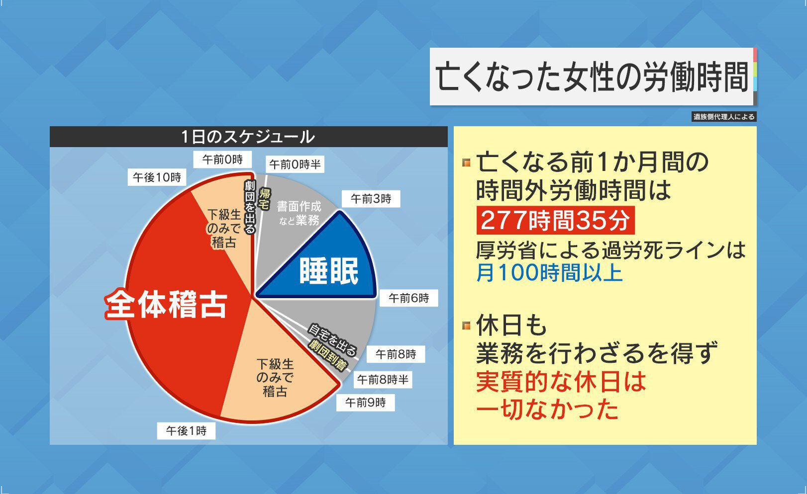 亡くなった女性の労働時間ですが、午前8時半に劇団に到着します。午前9時から稽古が始まりますが、午後1時からの全体稽古の前後にも新人公演に向けての下級生だけの稽古もあり、劇団を出るのは午前0時を回っています。帰宅は午前0時半ですが、その後も書面作成などもあり、睡眠時間が3時間ほどしかない状態が続いていたということです。厚労省による過労死ラインが月100時間以上ですが、亡くなる前1か月間の時間外労働時間は、277時間35分。休日も業務を行わざるを得ず、実質的な休日は一切なかったということです。