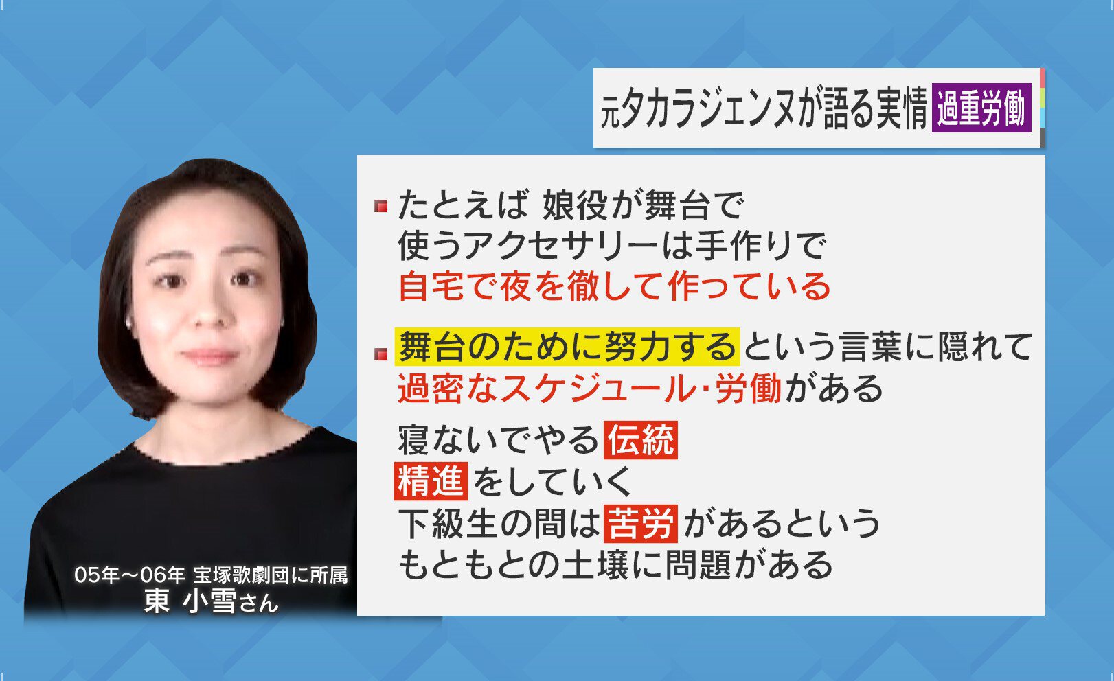 元タカラジェンヌの東小雪さんはミヤネ屋のインタビューに答えて、「たとえば、娘役が舞台で使うアクセサリーは手作りで、自宅で夜を徹して作っている。舞台のために努力するという言葉に隠れて、過密なスケジュール・労働がある。寝ないでやる伝統、精進をしていく、下級生の間は苦労があるというもともとの土壌に問題がある」と語っています。