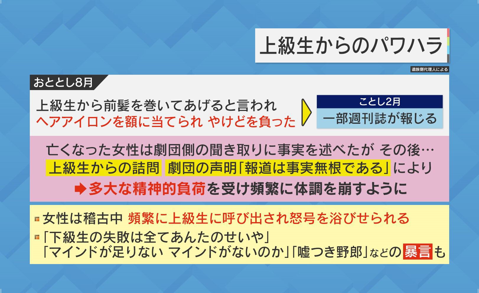 2021年8月、亡くなった女性が上級生から前髪を巻いてあげると言われ、ヘアアイロンを額に当てられやけどを負ったという内容が、今年2月、一部週刊誌が報じました。これについて、女性は劇団側の聞き取りに事実を述べましたが、その後上級生から詰問され、劇団が「報道は事実無根である」と声明を出したことで、多大な精神的負荷を受け頻繁に体調を崩すようになったということです。さらに女性は稽古中、頻繁に上級生に呼び出され怒号を浴びせられ、「下級生の失敗は全てあんたのせいや」「マインドが足りないマインドがないのか」「嘘つき野郎」などの暴言もあったということです。