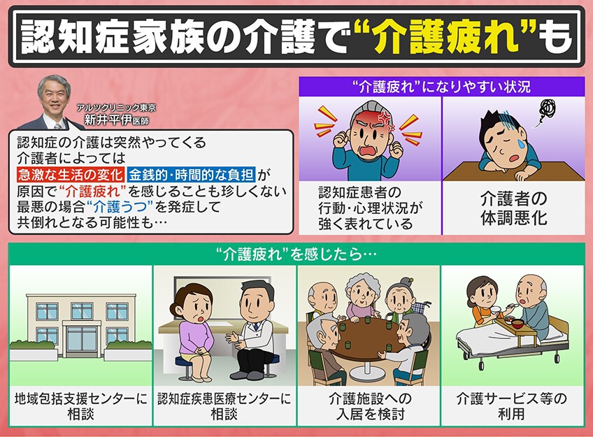 新井医師は、「認知症の介護は突然やってくる。介護者によっては急激な生活の変化、金銭的・時間的な負担が原因で“介護疲れ”を感じることも珍しくない。最悪の場合“介護うつ”を発症して共倒れとなる可能性も…」と指摘しています。介護疲れを感じたら、まずは、地域包括支援センターに相談、そして認知症疾患医療センターに相談しましょう。また、介護施設への入居を検討して介護サービス等の利用もして抱え込まないでください。