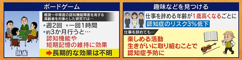 また、軽度~中等度の認知障害の人を対象にした研究では、「麻雀」を週2回、1日1時間、約3か月間行うことで、認知機能や短期記憶の維持に効果が見られたとの報告もあります。しかし、長期的な効果は不明となっています。そして、仕事を辞める年齢が1歳高くなるごとに認知症のリスクが3%低下するといいます。たとえ仕事を辞めたとしても、楽器や読書、登山など、楽しめる活動・生きがいに取り組むことが認知症の予防になります。