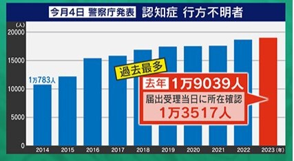 7月4日、警察庁が発表したものによると、警察庁に届け出があった認知症の行方不明者が、2023年は1万9039人と過去最多となりました。