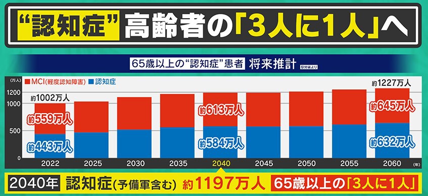厚労省が出した推計では、2022年は認知症の高齢者が約443万人、MCIという軽度認知障害(認知症予備軍)が559万人で合わせて1002万人ですが、年々徐々に増加していき、2040年には合わせて計1197万人で、65歳以上の約3人に1人が認知症、もしくはその予備軍になると予想されています。