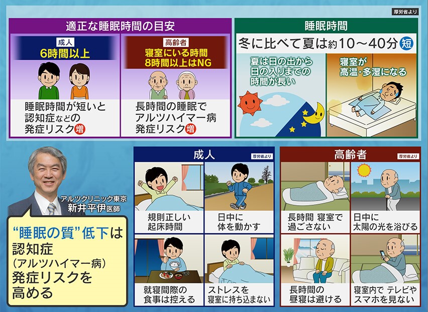 認知症を予防する適正な睡眠時間の目安ですが、成人は6時間以上を推奨しており、睡眠時間が短いと認知症などのリスクが高くなると言います。一方、高齢者は、寝室にいる時間が8時間以上にならないようにとされています。長時間の睡眠でアルツハイマー病の発症リスクが高くなるといいます。