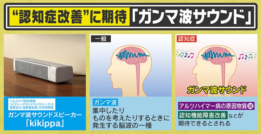 いま、アルツハイマー病の原因物質「アミロイドβ」を低減させると期待されているのが、「ガンマ波サウンド」です。『ガンマ波』とは、集中したりものを考えたりするときに発生する脳波の一種で、認知症のように認知機能が低下した人の場合は、ガンマ波が少ないとされています。しかし、『ガンマ波サウンド』を流し、脳にガンマ波を発生させることでアルツハイマー病の原因物質の減少、認知機能障害の改善などが期待できるとされています。