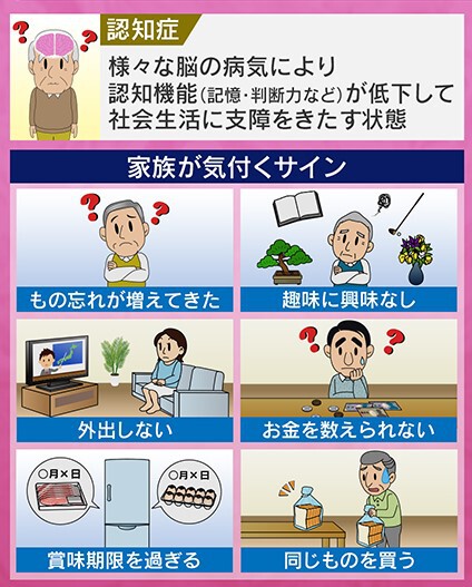 「認知症」とは、様々な脳の病気により認知機能(記憶・判断力)などが低下して社会生活に支障をきたす状態です。家族や周りが気付けるサインとしては、・もの忘れが増えてきた・趣味に興味なし・外出しない・お金を数えられない・賞味期限を過ぎる・同じものを買う などが挙げられます。