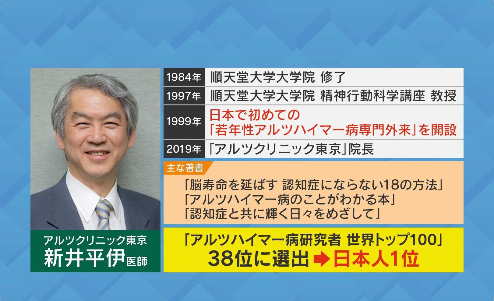 新井平伊医師は1999年、日本で初めての「若年性アルツハイマー病専門外来」を開設し、2019年からアルツクリニック東京院長を務めています。主な著書に「脳寿命を延ばす認知症にならない18の方法」・「アルツハイマー病のことがわかる本」「認知症と共に輝く日々をめざして」などがあり、「アルツハイマー病研究者の世界トップ100」の38位に選出されています。これは日本人のなかでは1位となります。