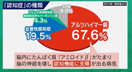 認知症の種類ですが、よく耳にするアルツハイマー病が一番多く67.6%となっています。それ以外にも血管性認知症などがあります。アルツハイマー病は、脳内にたんぱく質「アミロイドβ(ベータ)」がたまり、脳の神経を壊し認知機能に支障が出る病気です。
