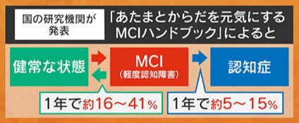 国の研究機関が発表している「あたまとからだを元気にするMCIハンドブック」によると、認知症の前段階である「MCI=軽度認知障害」は、何もしないと「認知症」に進む人が1年で5~15%いましたが、一方で、いろいろ予防に取り組むと「MCI」から「健常な状態」に戻った人が約16~41%いたというデータがあります。