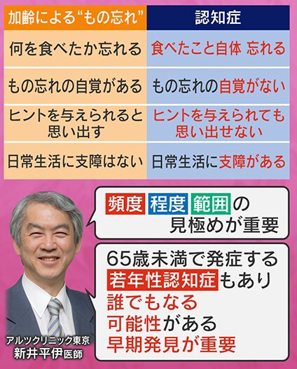 加齢によるものとの違いです。「何を食べたか忘れる」のは加齢によるものですが、「食べたこと自体を忘れる」のは認知症です。「もの忘れの自覚がある」のは大丈夫ですが「もの忘れの自覚がない」のは認知症です。また、「ヒントを与えられると思い出せる」のは加齢によるもの忘れですが、「ヒントを与えられても思い出せない」のは認知症です。「日常生活に支障がない」のは問題ありませんが「日常生活に支障がある」と認知症です。新井医師によると、「頻度・程度・範囲の見極めが重要」で「65歳未満で発症する『若年性認知症』もあり、誰でもなる可能性がある。早期発見が重要」だということです。