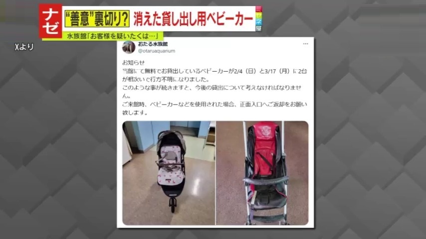 同年3月23日、この事態を公式Xで公表。『おたる水族館』の担当者は、「点検中にベビーカーがないことに気付いた。短期間で相次いだため、理事長に相談し、Xに投稿することになった」と話していて、現在も情報は得られていないということです。