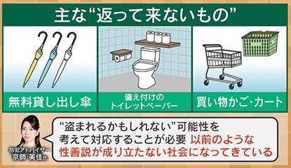 『無料の貸し出しの傘』『備え付けのトイレットペーパー』『買い物かご・カート』など、“返って来ないもの”は『おたる水族館』以外でも。防犯アドバイザー・京師美佳氏は、「盗まれるかもしれない可能性を考えて、対応することが必要。以前のような性善説が成り立たない社会になってきている」との見解を示しています。