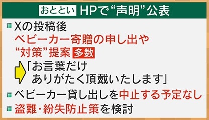 『おたる水族館』は2025年3月26日、ホームページで“声明”を公表。Xの投稿後、ベビーカー寄贈の申し出や“対策”提案などが多数寄せられているということですが、水族館側は「お言葉だけありがたく頂戴いたします」としています。ベビーカー貸し出しを中止する予定はなく、盗難・紛失防止策を検討しているということです。