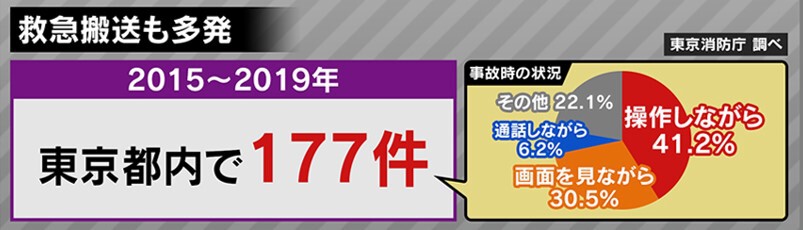 東京消防庁による調査では、2019年までの5年間、都内だけで歩きスマホが関連する事故は177件。内訳は、「スマホを操作しながら」、「画面を見ながら」を合わせると7割超。「通話しながら」が6%あまりなのに比べて、非常に多いことがわかります。