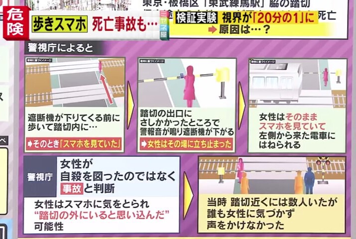 歩きスマホが原因で、深刻な事故へと至るケースも増えています。2021年7月、東京・板橋区「東武練馬駅」脇の踏切で、帰宅途中の女性(31)が電車にはねられ、死亡する事故がおきました。警視庁によると、遮断機が下りてくる前に歩いて踏切内に入り、そのとき『スマホを見ていた』ということです。その後、踏切の出口にさしかかったところで警報音が鳴り遮断機が下がるのですが、なぜか女性はその場に立ち止まります。女性はそのままスマホを見ていて、左側から来た電車にはねられたというのです。警視庁は、女性が自殺を図ったのではなく事故と判断。女性はスマホに気をとられ、“踏切の外にいると思い込んだ“可能性があり、当時、踏切近くには数人いたのですが、誰も女性に気づかず、声をかけなかったということです。