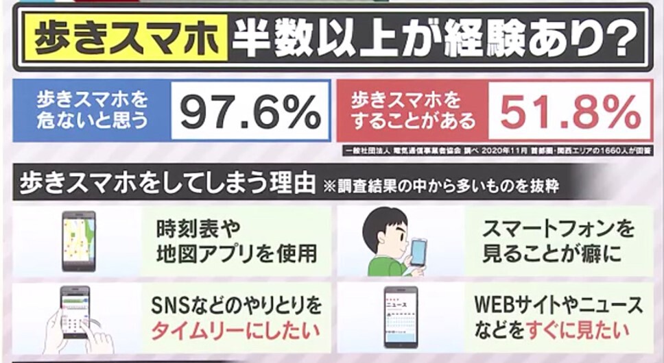 通信事業者の業界団体が2020年11月に行った、首都圏と関西を対象にした意識調査では、歩きスマホについて「危ないと思う」のは97.6%。ほとんどの人が、危険性を認識しています。一方で、「歩きスマホをすることがある」と答えた人は51.8%。半数の人が、歩きスマホをしてしまっている実態が明らかになりました。同じ調査の中で、歩きスマホをする理由について最も多かったのが、「時刻表や地図アプリを使用するのが便利」というもの。その他にも、「スマホを見るのがクセになっている」、「SNS、LINE、メールなどのやりとりをタイムリーにしたい」、「WEBサイトやニュース、情報などをすぐに見たい」といった回答が多く挙げられました。