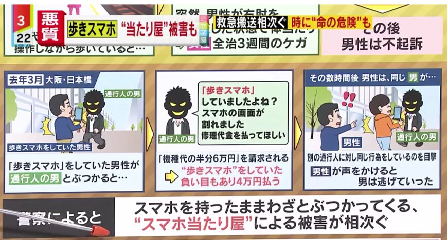 さらに、2020年3月、大阪・日本橋で「歩きスマホ」をしていた男性が通行人の男とぶつかると、その通行人の男は「歩きスマホしていましたよね?」と言い、持っていた携帯が「壊れた」と主張。「機種代の半分6万円」を請求されたのです。男性は「歩きスマホ」をしていた負い目もあり、渋々4万円を払いました。しかしその後、用事を終えた男性は、同じ通行人の男が別の通行に対し同じ行為をしているのを目撃し、「あなた、私ともそれをやりましたよね」と声をかけると、男は逃げていったというのです。警察によると、スマホを持ったままわざとぶつかってくる、“スマホ当たり屋”による被害が相次いでいて、注意を呼びかけています。