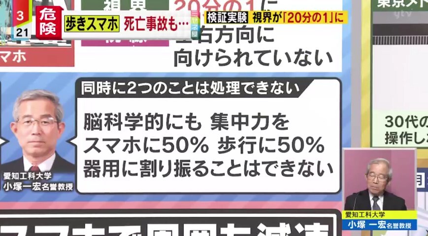 「まず今回非常に痛ましい事故で、お悔やみを申し上げます。たぶんグッとスマホに集中されて、それで周りが十分見えてなかったんじゃないかなと想像しています。人間は、同時に2つの事をやろうとしますと、脳で同時に認識することはまずできません。その人の興味とか関心の強い方に、脳の認識も意識も集中してしまう。ですから今回も、そんなことが背景にあるんじゃないかと考えております。」