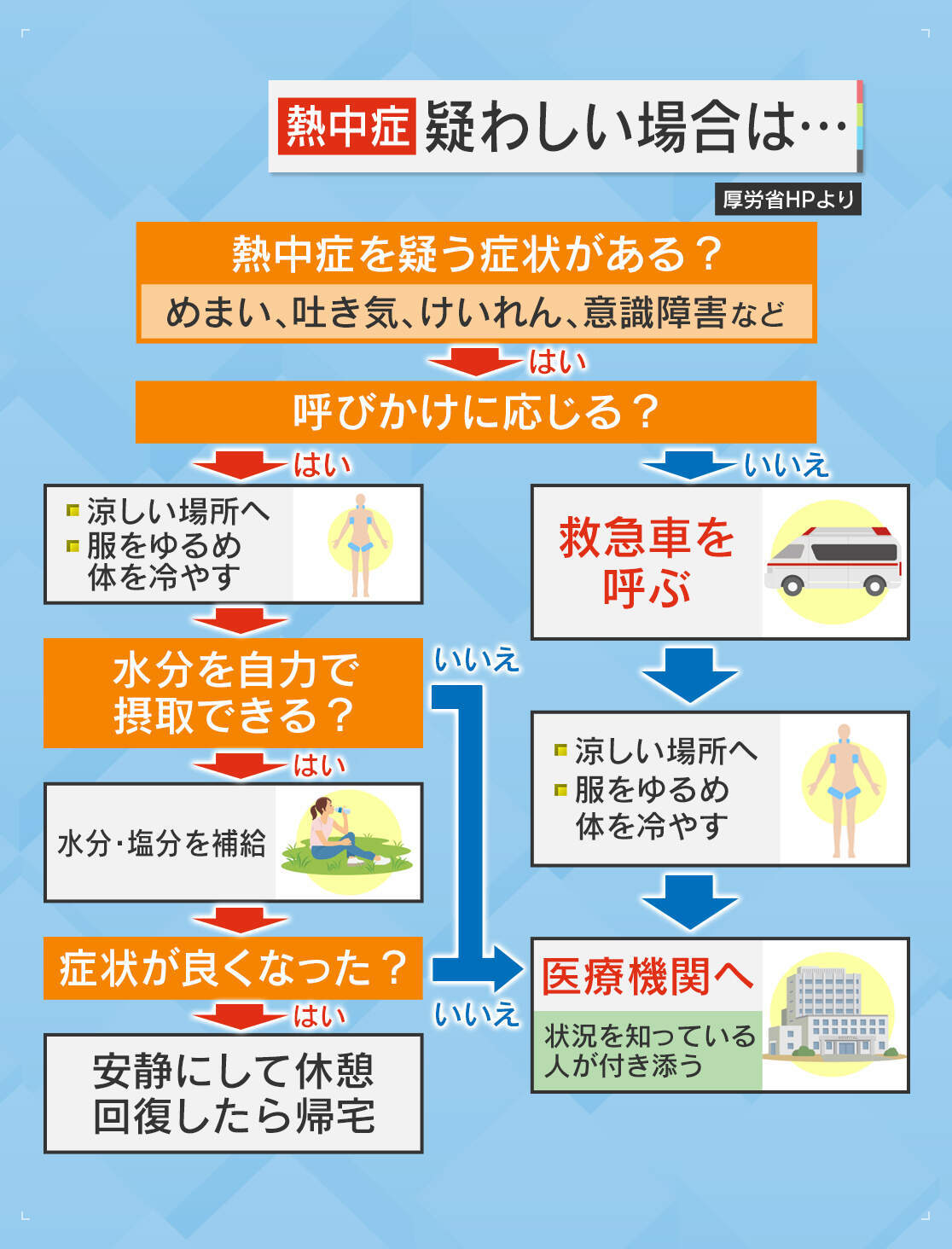 熱中症の疑いがあった場合の対応について厚生労働省のチャートによると、症状があって呼びかけに応じない場合はすぐに救急車を呼ぶことが重要です。そして救急車を待っている間に涼しい場所に移動して体を冷やしてください。呼びかけに応じる場合でも、水分を自力で摂取できない場合は医療機関に相談するようにしてください。