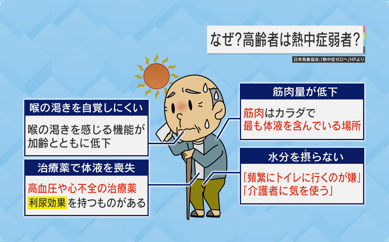 また、高齢者はのどの渇きを自覚しにくい、高血圧の薬などで水分不足に陥りやすい、体で最も水分を含んでいる筋肉の量が減っている、頻繁にトイレに行くのを嫌う、介護者に気を使って水分を取らないなどの理由で、熱中症弱者と言われていて、注意が必要です。