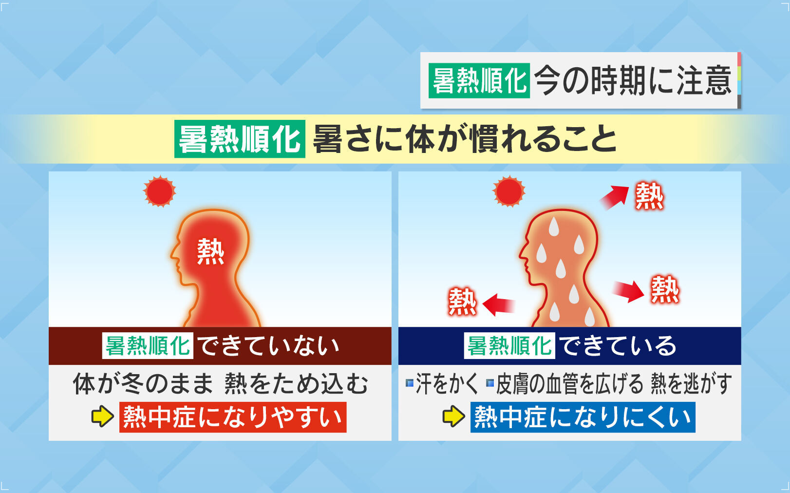 また、今の時期大事なのが「暑熱順化」です。「暑熱順化」というのは暑さに体が慣れることで、これができていないと、体が冬のまま熱をため込みやすい状態で熱中症なりやすいということです。「暑熱順化」ができていると、汗をかいたり血管を広げたりすることで、熱を逃がすので熱中症になりにくいということです。