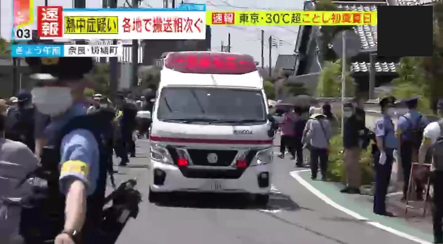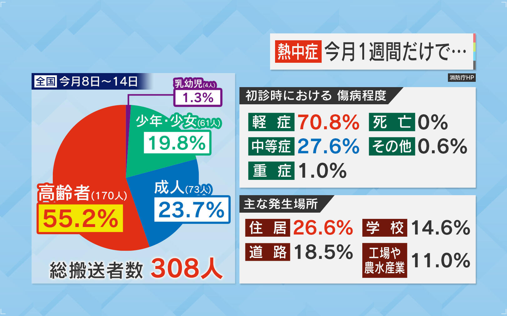 5月8日~14日の1週間、全国で308人が熱中症で病院に搬送されたということです。そのうち約半数が高齢者でした。初診時に中等症以上という人は3割近くいて、発症場所で一番多かったのは住居・室内となっています。