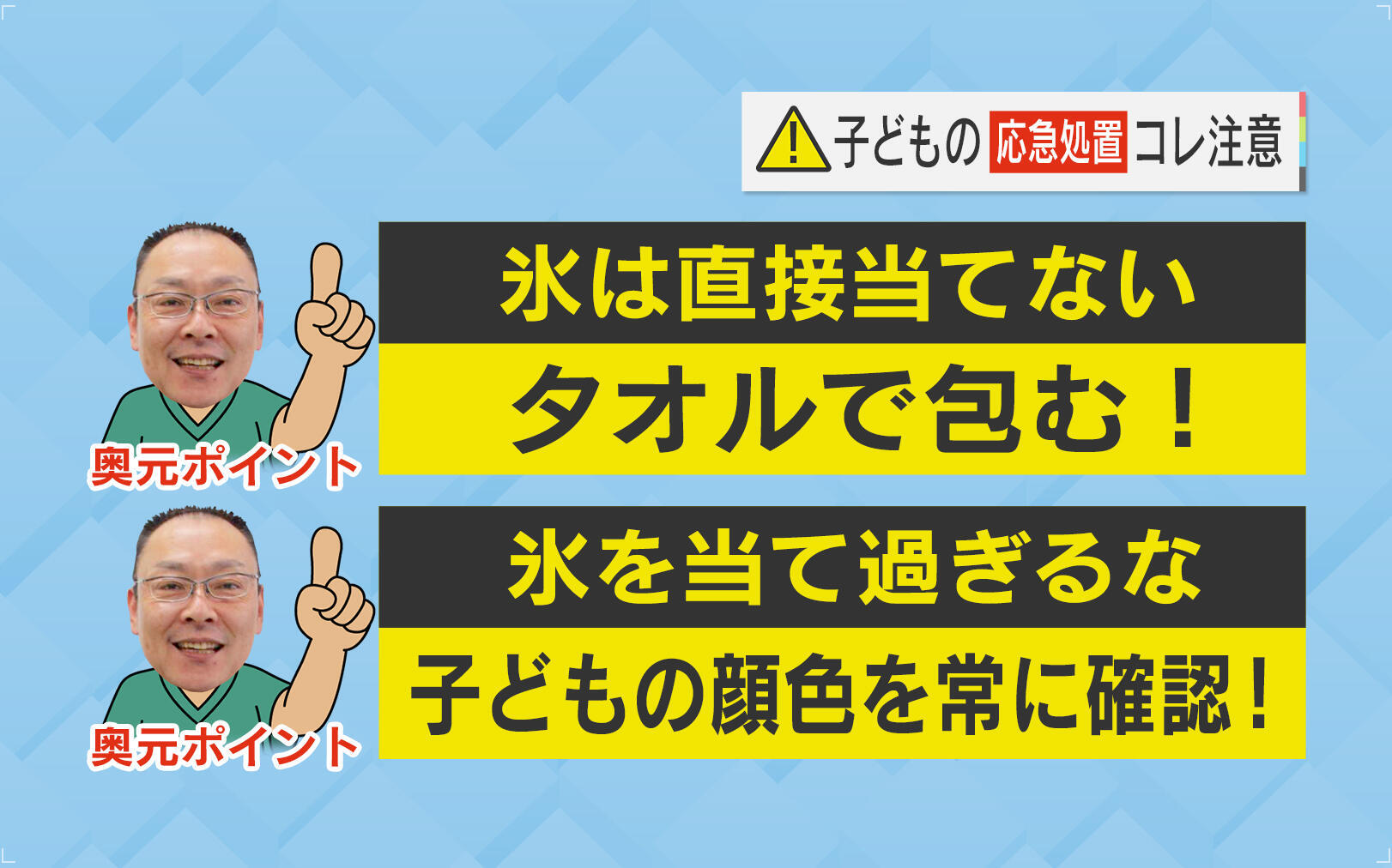 奥元氏によると子どもの熱中症の応急処置をするときには、氷を直接当てないことと、氷の当てすぎに注意が必要だということです。