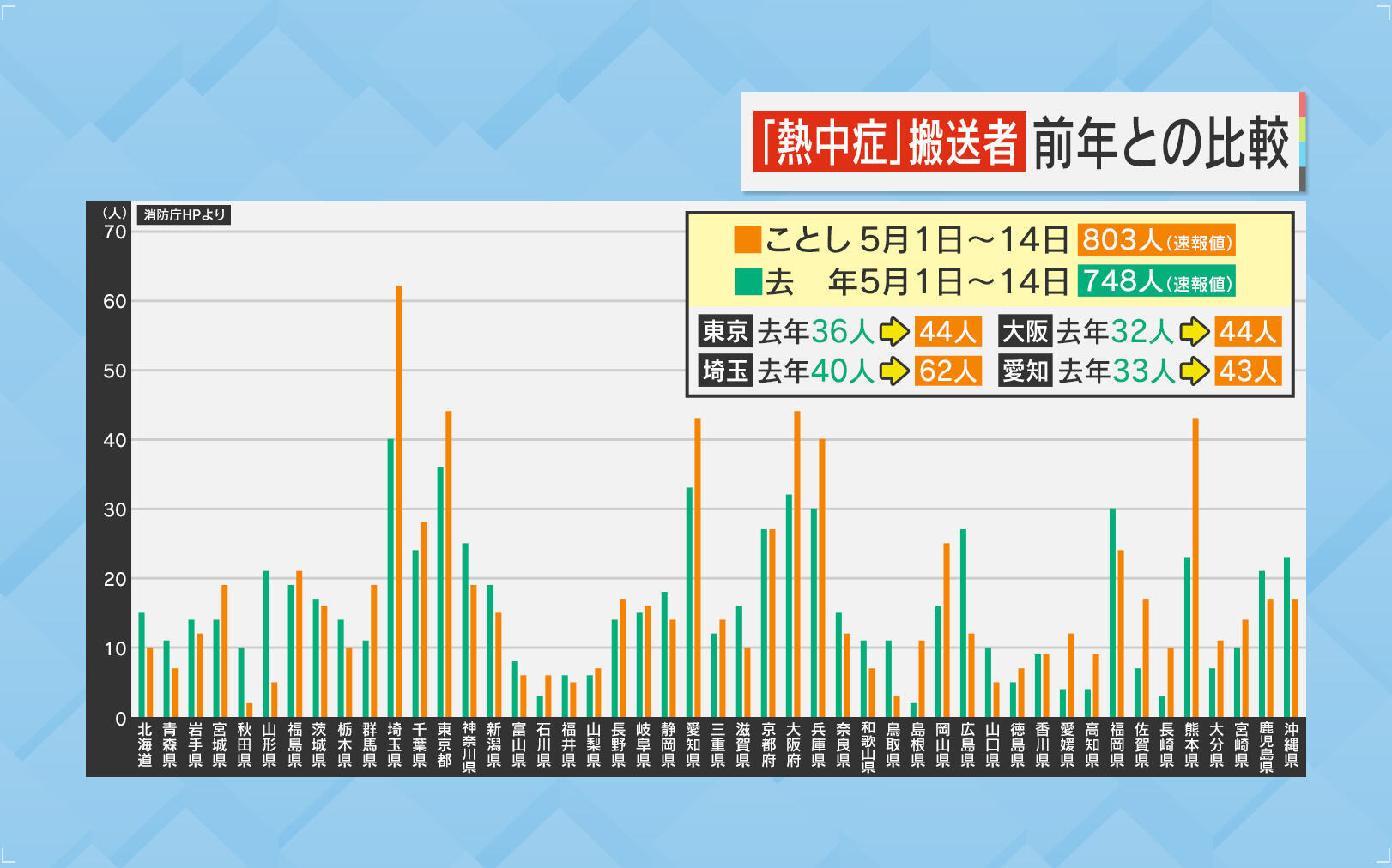 5月に入ってからの全国の都道府県ごとの熱中症の搬送者数を昨年と比較すると、埼玉県・東京都・愛知県・大阪府などが昨年より多くなっています。全国でみると、昨年の748人に対して今年は803人と50人以上増加しています。