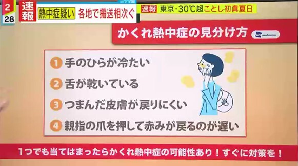 かくれ熱中症にも注意が必要です。①手のひらが冷たい②舌が渇いている③つまんだ皮膚が戻りにくい④親指の爪を押して赤みが戻るのが遅い、この中で1つでも当てはまったら隠れ熱中症の可能性があります。