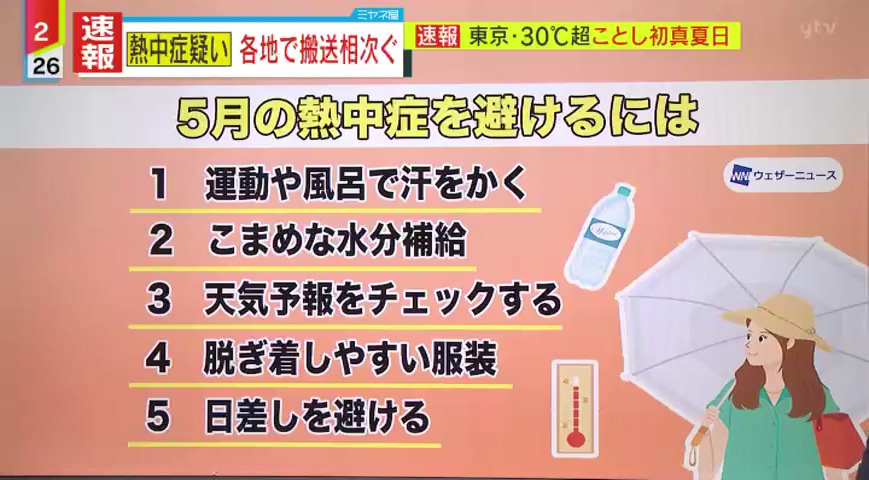 5月の熱中症を避けるには、運動や入浴で汗をかいて、汗をかきやすい体にしていくこと。時間を決めてこまめな水分補給をすること。日ごとの寒暖差が大きいので、天気予報をチェックして服装などでうまく調整すること。空気が乾燥していて日陰に入ると暑さをしのぎやすいので、こまめに日陰で休むことなどが大切です。