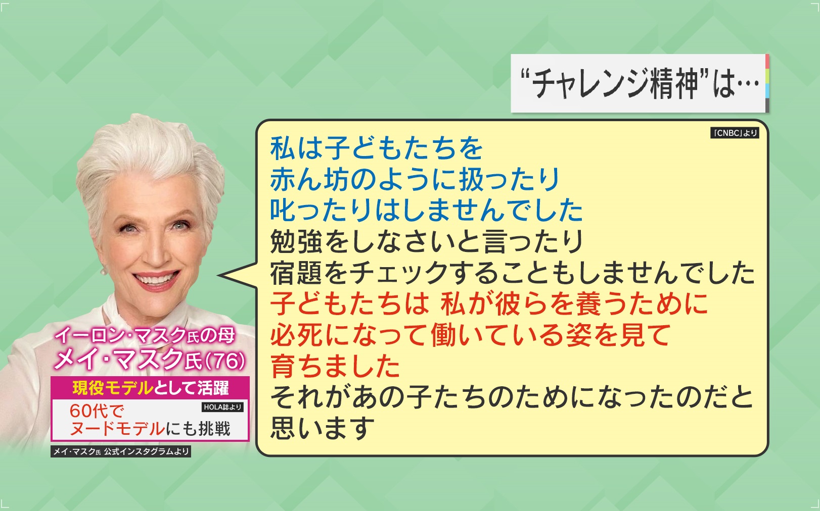 メイ氏は76歳にして現役モデルとして活躍していて、『HOLA』誌によると60代でヌードモデルにも挑戦したといいます。『CNBC』によると、メイ氏は“チャレンジ精神”について、「私は子どもたちを赤ん坊のように扱ったり、叱ったりはしませんでした。勉強をしなさいと言ったり、宿題をチェックすることもしませんでした。子どもたちは、私が彼らを養うために必死に働いている姿を見て育ちました。それが、あの子たちのためになったのだと思います」と語っていました。
