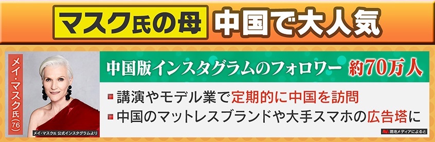 中国版インスタグラムのフォロワー数は約70万人だというメイ・マスク氏(76)。現地メディアによると、講演やモデル業で定期的に中国を訪れていて、中国のマットレスブランドや大手スマホの広告塔にもなっているということです。