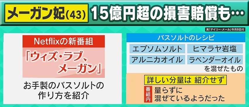 メーガン妃はNetflixの新番組『ウィズ・ラブ、メーガン』の中で、お手製のバスソルトの作り方を紹介しました。バスソルトは、エプソムソルト・ヒマラヤ岩塩・アルニカオイル・ラベンダーオイルを混ぜたもので、番組内では詳しい分量は紹介していませんでした。