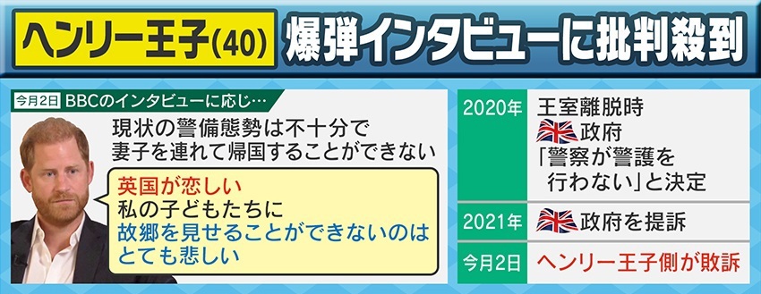 インタビューの背景には、2020年、王室を離脱する際に、イギリス政府は『警察が警護を行わない』と決定したことです。2021年に、ヘンリー王子側はイギリス政府を提訴しましたが、2025年5月2日に、敗訴となりました。