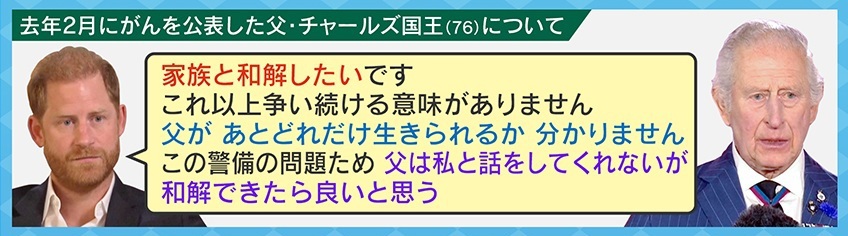 そして、ヘンリー王子は、2024年2月にがんを公表したチャールズ国王(76)について、「家族と和解したいんです。これ以上、争い続ける意味がありません。父があとどれだけ生きられるか分かりません。この警備の問題のため、父は私と話をしてくれないが、和解できたら良いと思う」と答えました。