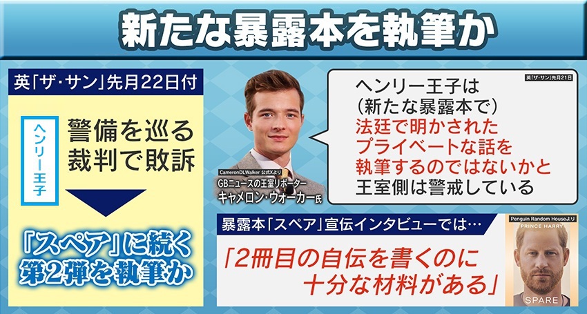 2025年4月12日付のイギリスの『ザ・サン』によると、ヘンリー王子が、警備を巡る裁判で敗訴し、暴露本の『スペア』に続く第2弾を執筆しているのではないかと報じました。GBニュース王室リポーターのキャメロン・ウォーカー氏によると「ヘンリー王子は、(新たな暴露本で)法廷で明かされたプライベートな話を執筆するのではないかと王室側が警戒している」とのことです。