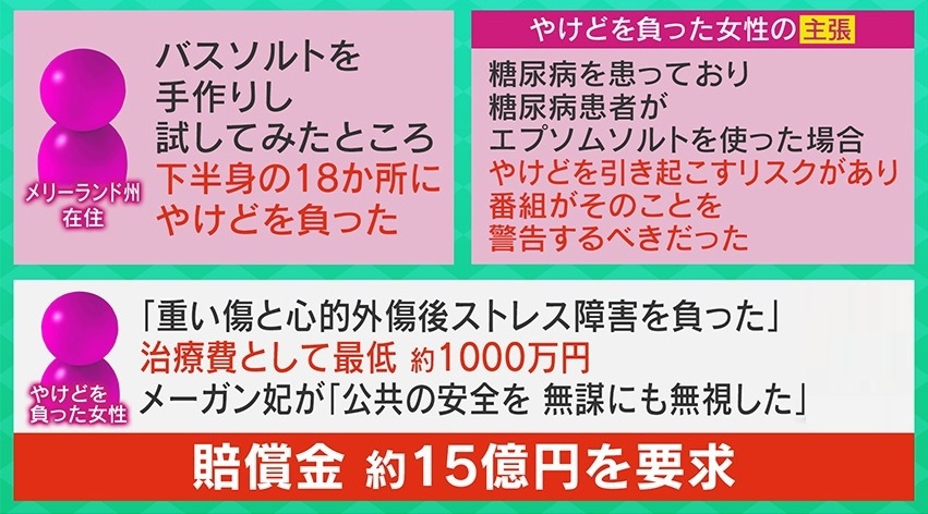 やけどをしたアメリカ・メリーランド州在住の女性は「糖尿病を患っており、糖尿病患者がエプソムソルトを使った場合、やけどを引き起こすリスクがあり、番組がそのことを警告するべきだった」と主張しています。