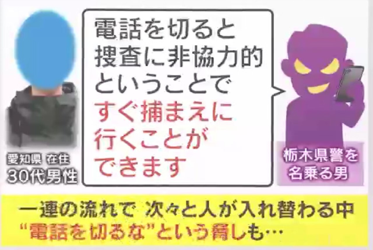 男性は、“栃木県警を名乗る男”から「今まで通りの生活を送るため『資産調査』をかけることができますが、検事の判断に任せないといけません」と言われ、「電話を切ると、捜査に非協力的ということで、すぐ捕まえに行くことができます」と、一連の流れで次々と人が入れ替わる中、“電話を切るな”という脅しまでされたということです。