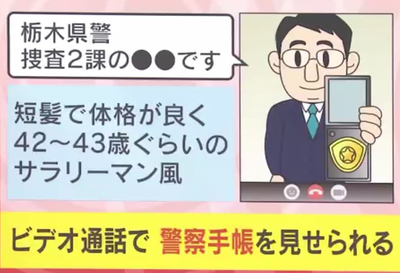 男性によると、ビデオ通話では、短髪で体格が良いサラリーマン風の男(42~43歳)が「栃木県警捜査2課の●●です」と警察手帳を見せてきたということです。