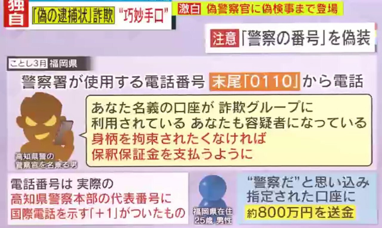 男性によると、電話番号は実際の高知県警察本部の代表番号に国際電話を示す「+1」がついたものでしたが、 “警察だ”と思い込み、指定された口座に約800万円を送金してしまいました。