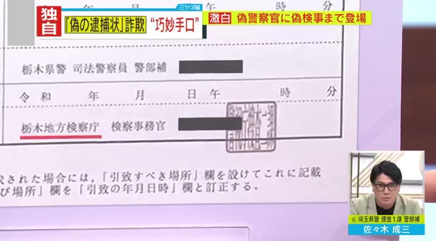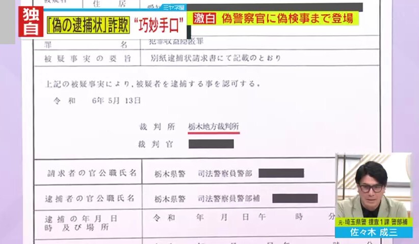 また、佐々木氏は写真で送られてきた“逮捕状”にも矛盾があると指摘。そこには、「逮捕状(緊急逮捕)」「被疑者(男性)の氏名・年齢・住居・職業等」「裁判所 栃木地方裁判所」「請求者の官公職氏名 栃木県警・司法警察員警部 ●●」「逮捕者の官公職氏名 栃木県警・司法警察員警部補 ●●」「記名押印 栃木地方検察庁・検察事務官」などと書かれていて、男性の個人情報には間違いがなかったということですが…。