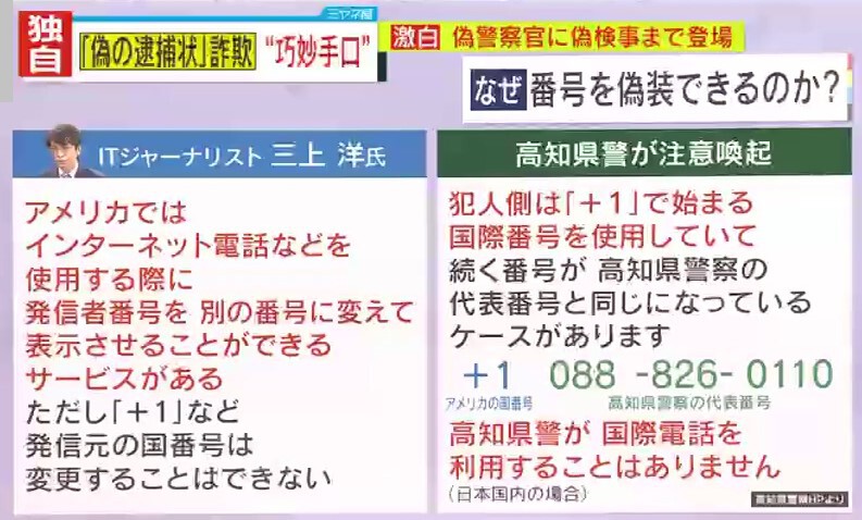 『+1』はアメリカの国番号で、高知県警は「犯人側は『+1』で始まる国際番号を使用していて、続く番号が高知県警察の代表番号(088-826-0110)と同じになっているケースがあります。高知県警が国際電話を利用することはありません(日本国内の場合)」と、注意喚起しています。