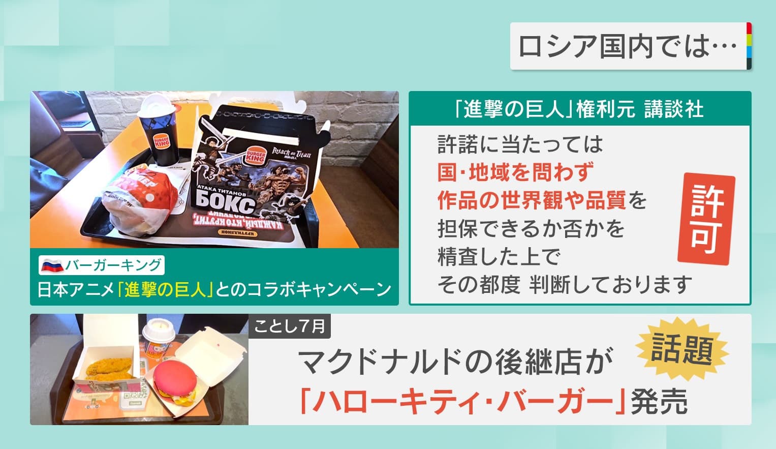 また、ロシアでは日本のアニメが人気で、今、ロシアの『バーガーキング』では、アニメ『進撃の巨人』とのコラボキャンペーンを実施しているといいます。パッケージにアニメのキャラクターが載っていますが、『進撃の巨人』の権利元である講談社はこれを許可していて、「許諾にあたっては国・地域を問わず、作品の世界観や品質を担保できるか否かを精査した上で、その都度判断しております」としています。